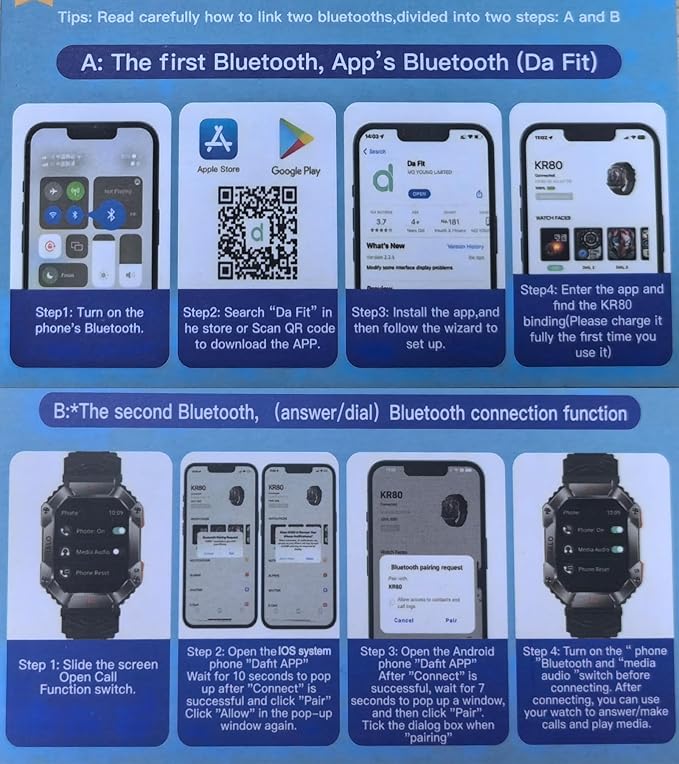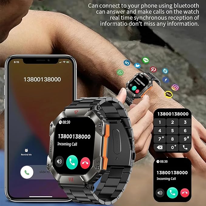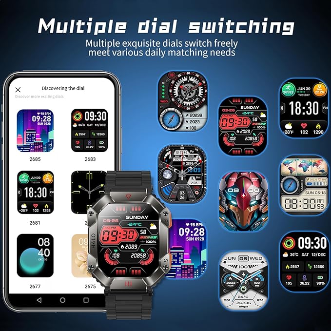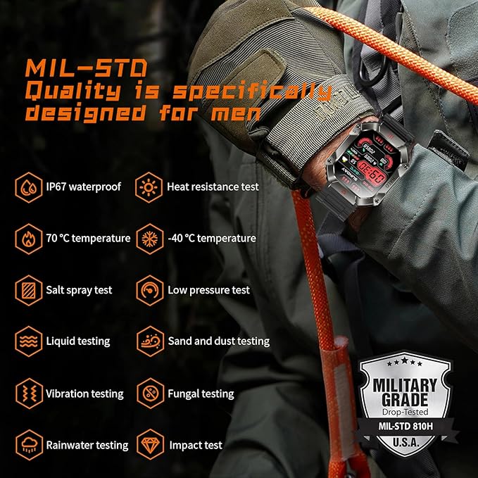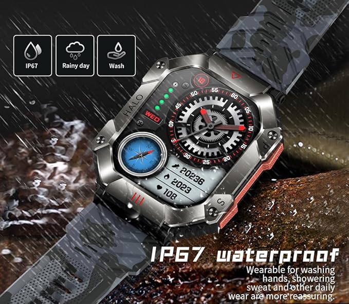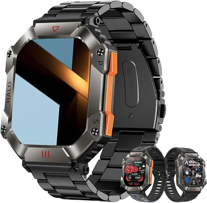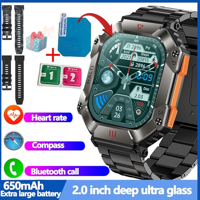 - Nice Gift Choice - An outdoor military style men's smartwatch with fashionable appearance, diverse functions, practical and versatile. The package has an extra gift of two different color watch straps, a protective film and wiping screen cleaning paper.