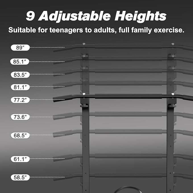 - 9 Adjustable Heights, The pull up bar features reinforced steel tubing, making it more durable,with two ways to do pull-ups. 56.5-89 IN adjustable heights with 9 holes,a lowest setting designed for children, the pull-up bar free-standing tower is perfect for the whole family to work out. 4 adjustable wide-fitted backrest settings cater to the whole family's workout needs, providing added comfort for dips.
