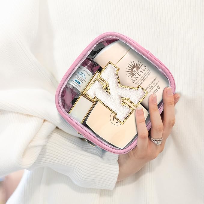- Personalized Initial Letter Clear Makeup Bag Organizer:Preppy makeup bag boasts a gold glitter chenille patch that is not only stylish but also skin-friendly and comfortable to touch.It's your exclusive makeup bag.You can organizing various items such as cosmetics, lipsticks, hair accessories, snacks, and jewelry. They also work well as coin purses, providing convenient storage for daily use.