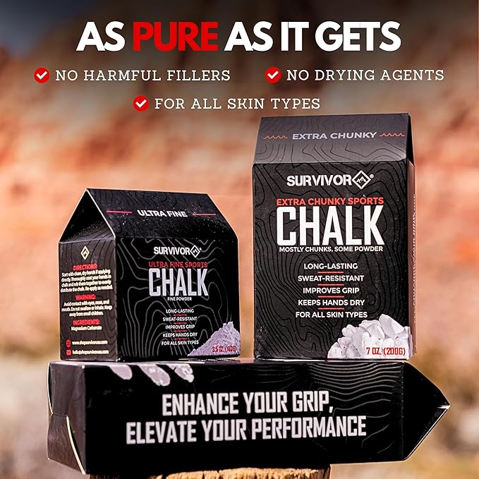 - MORE CHALK FOR LESS - Enough with the overpriced chalk! Survivor offers more chalk in each box at a significantly cheaper price than the leading brand. Enjoy better performance at a cheaper price and reach the next level in rock climbing, weightlifting, gymnastics, cheer, bouldering, and any other sport or activity that requires better grip.