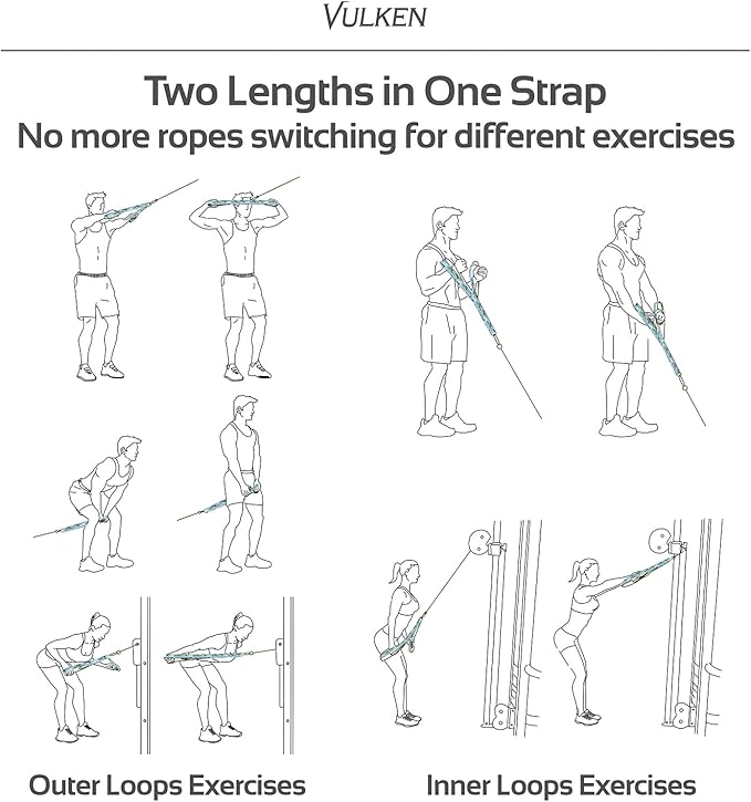- One Triceps Rope for Diversified Exercises – No need to switch between multiple triceps ropes of different sizes for various exercises anymore. With the Vulken triceps strap, you can handle it all with just one rope. Its two-lengths-in-one design provides great versatility to your workout routine by allowing you to easily switch lengths between different rope exercises such as face pulls, triceps pushdowns, bicep curls, and more cable attachment exercises.