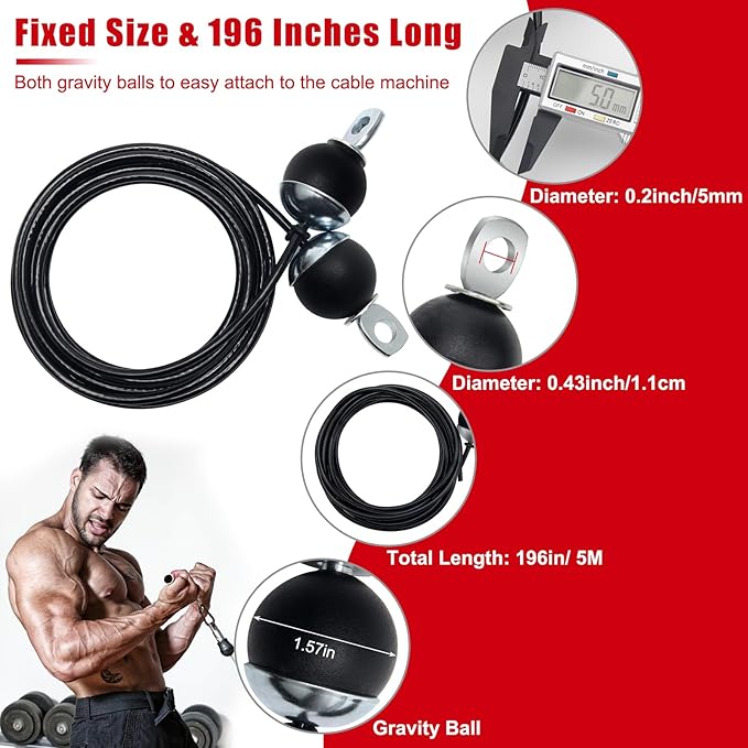 • 【Fixed Cable】: Fitness pulley cable has 2 gravity ball in 1.57 inches in diameter, prevent the rope from shaking to ensure the smoothly running while exercise. Fixed ends no need extra tool, suitable for home gym cable replacement