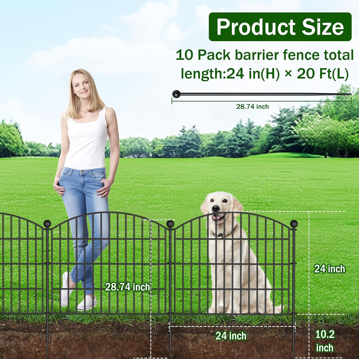 10 Panels No Dig Decorative Garden Fence Animal Barrier - 24 in (H) x 20 ft (L) - Dog Fence Outdoor for Yard, Rabbits and Small Pets - Tall Rustproof Metal Wire Fencing Border for Garden and Patio