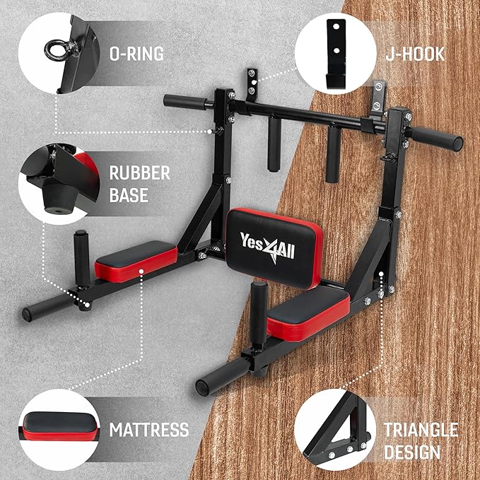 - 2-IN-1 GYM EQUIPMENT: Yes4All multifunctional wall mounted chin up/ pull up bar mix with dip bar may be used for pull ups and dip ups workouts to target different muscle groups.