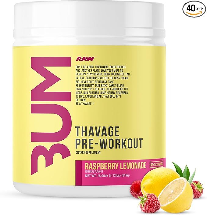 - Raspberry Lemonade Thavage Pre-Workout: Introducing Raw Nutrition’s Thavage Pre-Workout. Formulated with a blend of high-quality natural ingredients like caffeine, beta-alanine, and L-citrulline, Thavage provides a potent boost of energy and focus to help you push through even the toughest workouts. 40 servings, 1.13lbs.