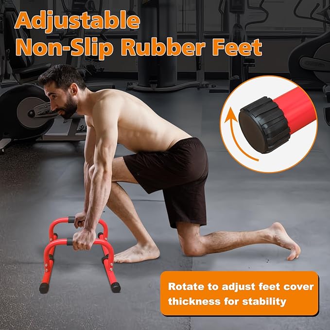 - 💪【Adjustable Non-Slip Feet】The dip bar bottom foot cover is made of premium rubber material, great for anti-slip to keep you safe while preventing damage to the floor. And the unique different thickness design of the foot cover rotates to adjust the balance of the base, even on uneven ground.
