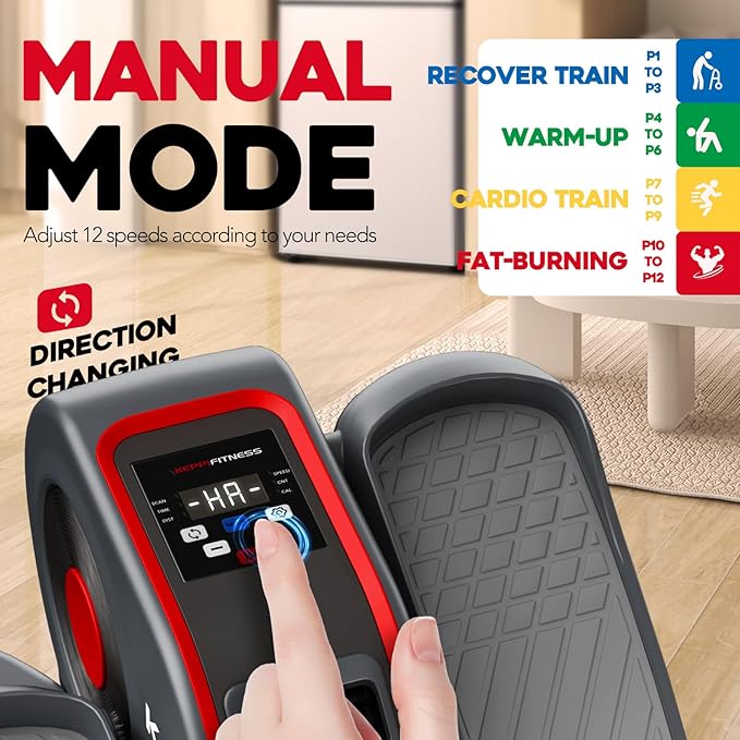 - Manual Mode - Adjusting speed and direction according to own exercise needs. The speed of the mini elliptical machine increases continuously from level 1 to level 12. In manual mode, you can change the running direction of the pedals to train different muscle groups.
