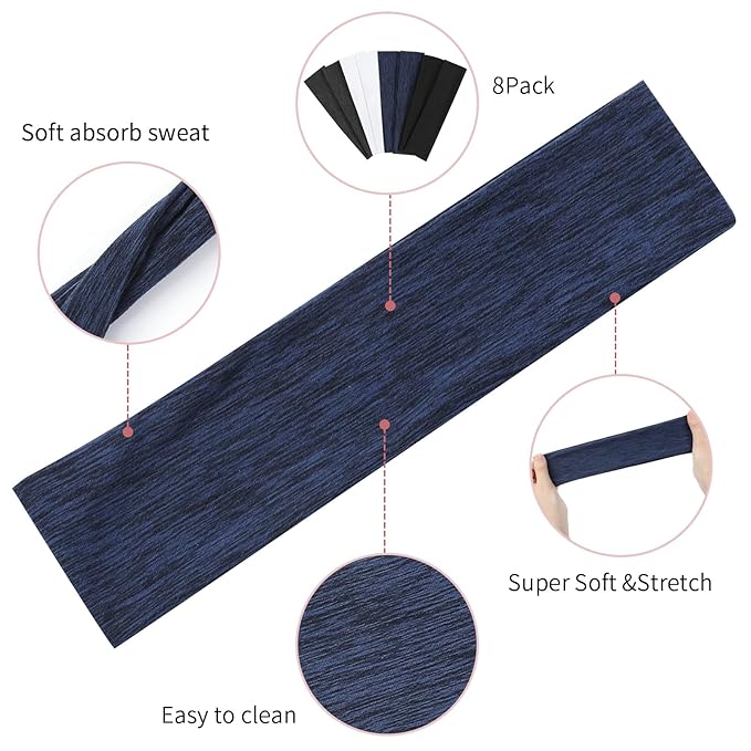 8 Pack Sport Headbands for Women, Elastic Soft Fabric Non-Slip Hair Bands Hair Warp for Daily Workout Yoga Running Sports