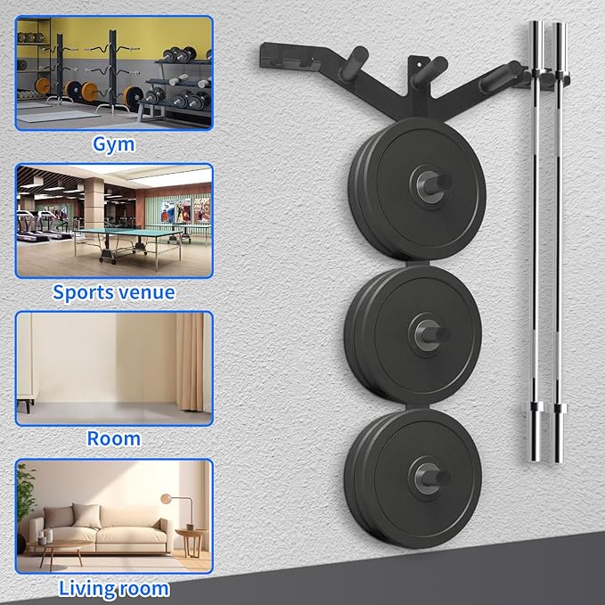 - Fit 2" Weight Platesy/Barbell: Our product can hold up to 4 Olympic barbells and 6 Olympic weight plates, with a wall-mounted design to save space in your gym. NOTE - Please refer to our size chart for weight plates before buying.