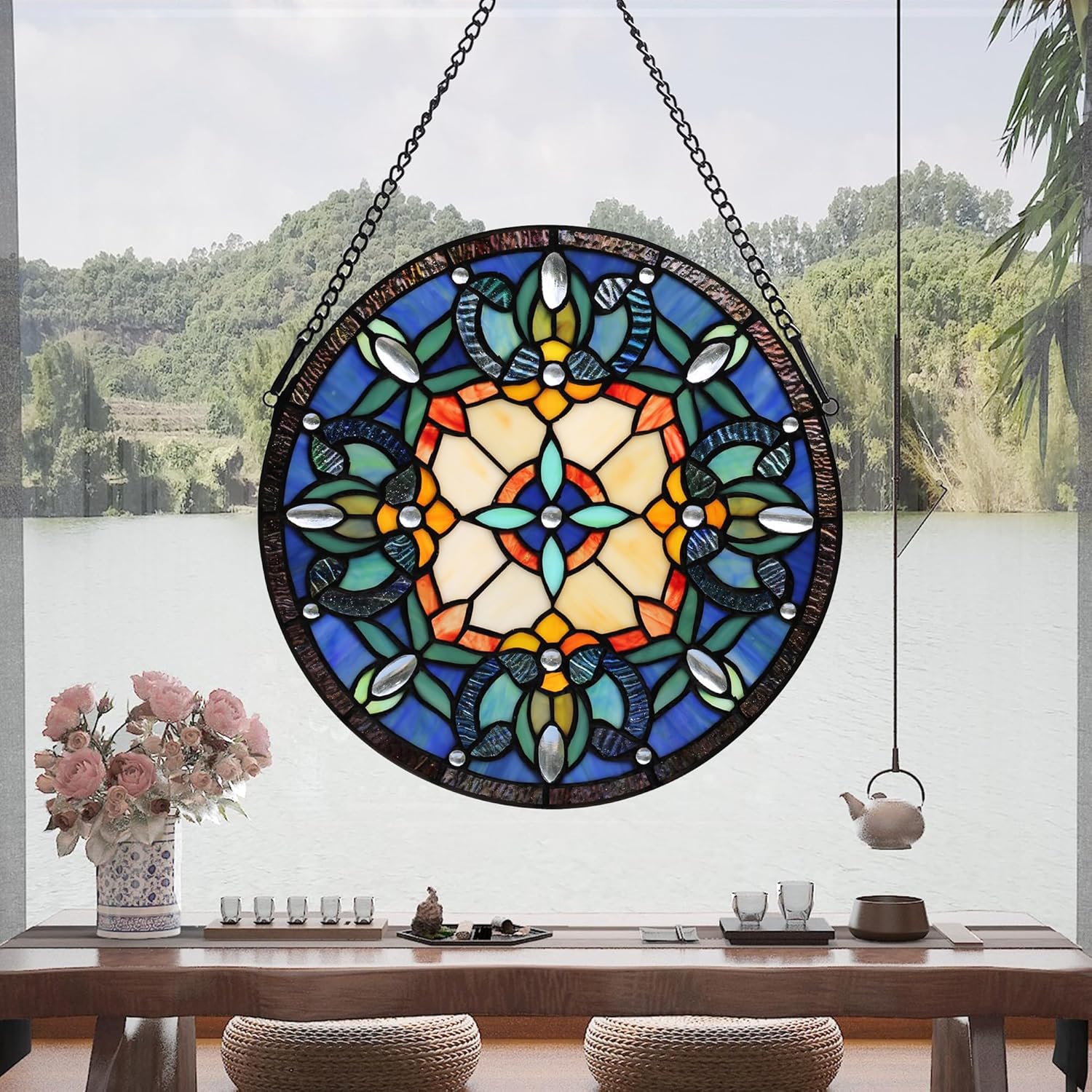 - This 12-inch round window panel is meticulously handcrafted by skilled artisans, with each glass piece carefully cut and assembled. The intricate patterns and vibrant colors give each panel a unique, artistic appeal, making it a stunning addition to any space.