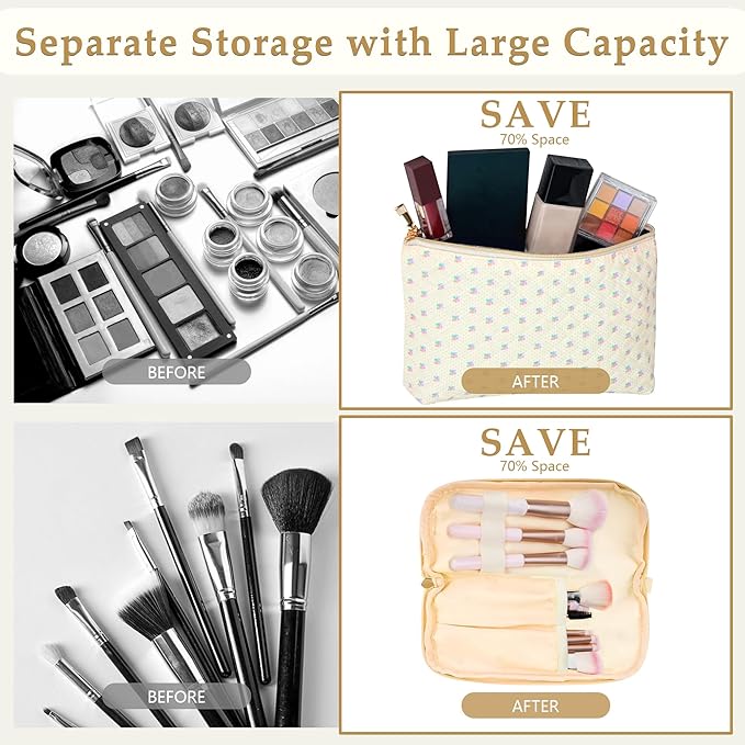 - 【Elegant Quilting】: Step up your beauty game with our elegantly quilted makeup pouch, blending sophistication and practicality effortlessly. These cute makeup pouches come in two sizes: a larger one measuring 7.2in * 2.5in * 10.5in and a smaller one measuring 9 in * 2 in * 4.2 in—both slightly larger than the size of your hand.