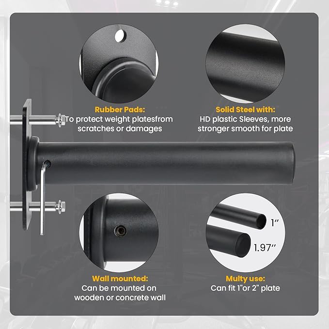 - Space Saving - 4 pack EVERYMATE wall mounted weight plates holders, Categorize Olympic weight plates of different weights for storage, Compared to floor rack storage, wall mounted weight plate holder is much more compact