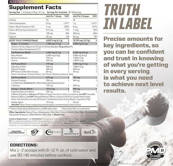 - Product Quality Ensured: ACG3 Fully Charged features Truth In Label, which is PMD’s version of label transparency. This pre-workout lists precise amounts for its key ingredients, so you can be confident and know what you’re getting in every powerful serving.
