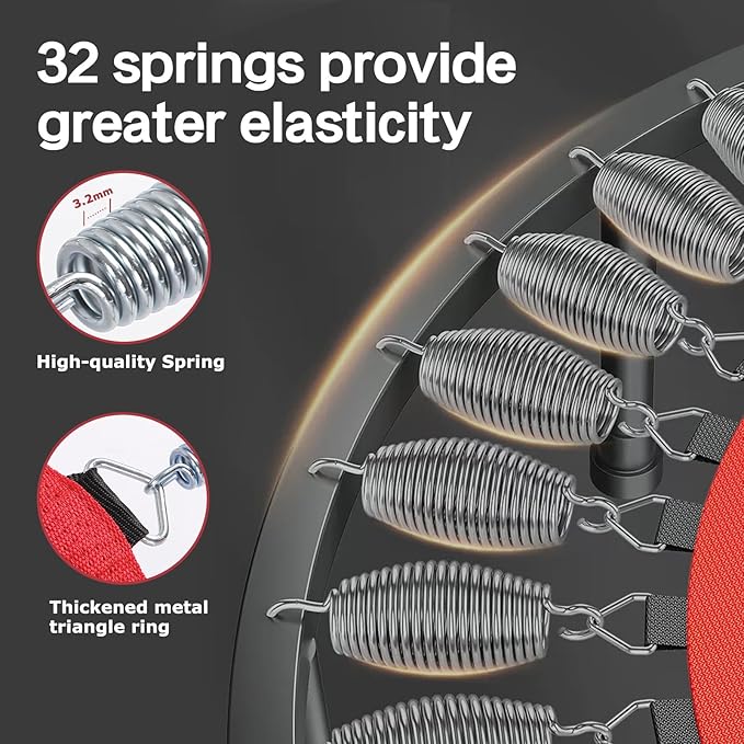 - Safe Closed-Spring Jumping System:Engineered with 360° sealed springs and Oxford cloth mat, our exercise trampoline for adults eliminates pinch hazards while delivering powerful bounce. The noise-reduced base ensures quiet workouts, making it a top-rated indoor trampoline for apartments.
