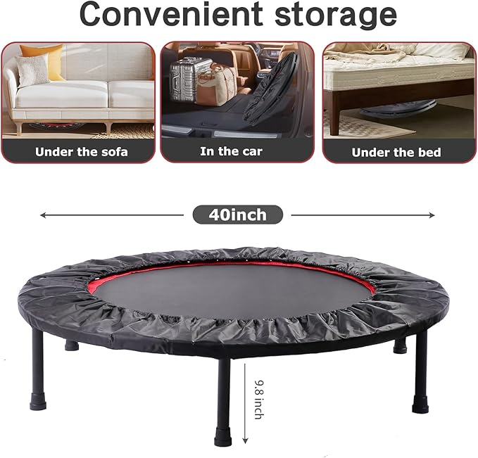 - Ultra-Convenient Foldable Design:As a foldable trampoline, it effortlessly collapses into a compact size for storage under beds, in closets, or car trunks. Ideal for small spaces, this portable design lets you transition from home gyms to backyard workouts in seconds.