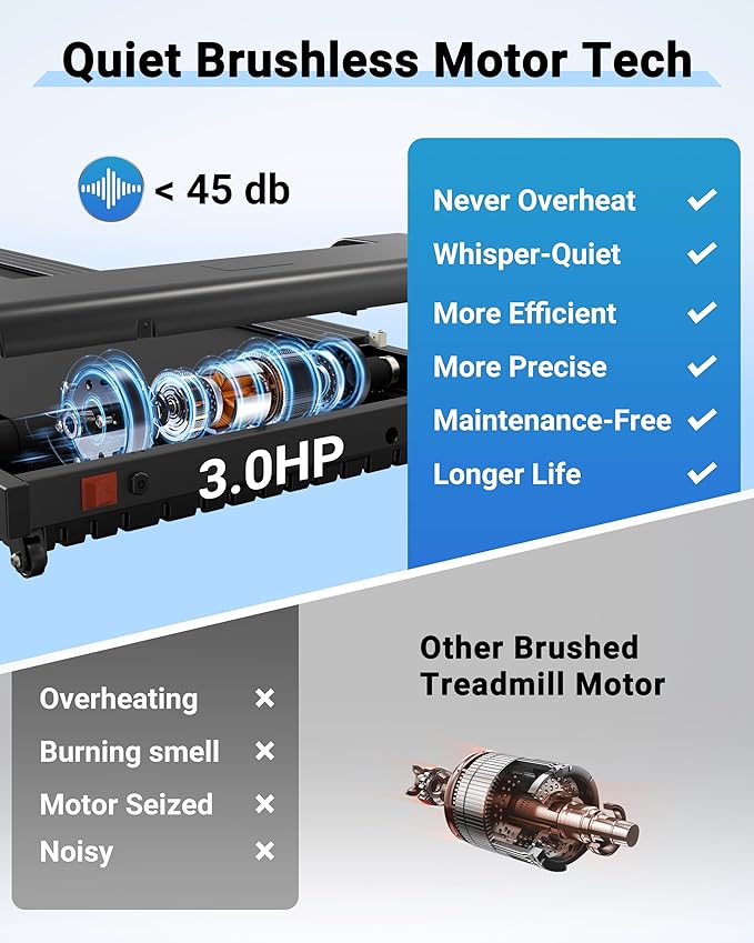 - Advanced Brushless Motorized: Equipped with cutting-edge 3.0HP brushless motor, guaranteeing top-notch performance without any overheating issues, operating ultra-quietly, and boasting a longer lifespan compared to brushed motor treadmill on the market