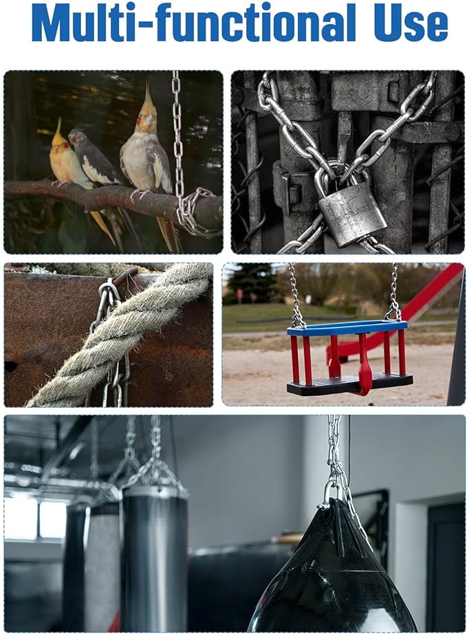 - Multifunctionality: Fitness chains are suitable for fitness equipment of stretching type, lat pull down, power racks, small weight lifting plates. Cable machine extensions can also lock outdoor gates, stables, pet doors and more