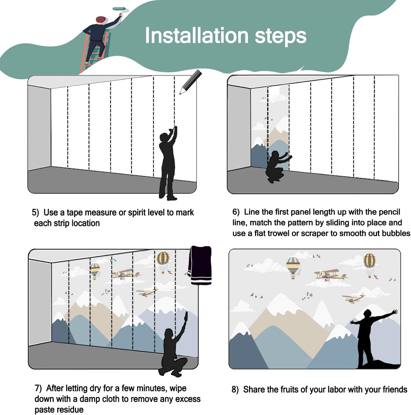 - Mural wallpaper size: 180 "W x 115 "H, divided into 9 sections, each section is labeled with a number underneath, there is no need to overlap the pattern when installing, just install according to the number labeled underneath the panel