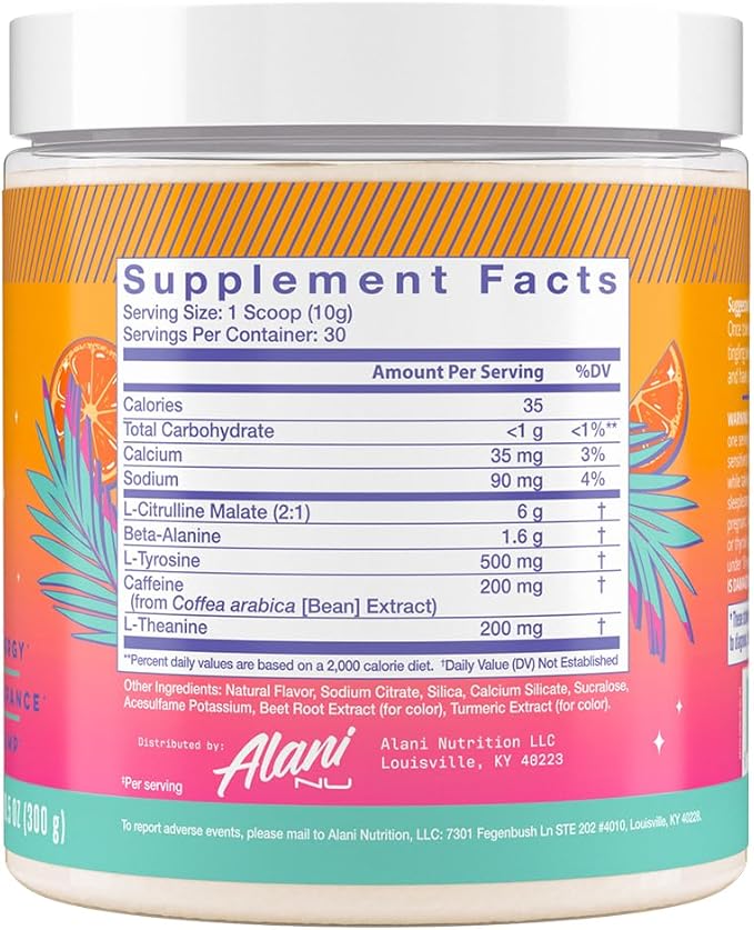 - INCREASE PERFORMANCE: Take 20-30 minutes before your workout for sustained energy and endurance to help achieve your fitness goals. Alani Nu Preworkout contains essential amino acids like L-Theanine to prevent you from crashing, L-Citrulline to improve the amount of oxygen in your muscle tissue, provides enzymes crucial to cardiovascular health, and beta alanine to regulate lactic acid accumulation in muscles.