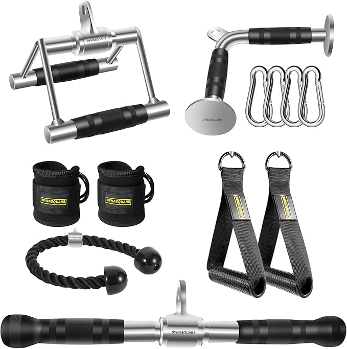 - ✅Combo includes: 1x V-Handle (Double D Handle), 1x V-Shaped Bar, 1x Straight Rotating Pull Down Bar, 1x Tricep Rope, 2x Exercise Handles, 2x Ankle Straps, 4x Black Carabiner Clips, Universal design fits most cable systems