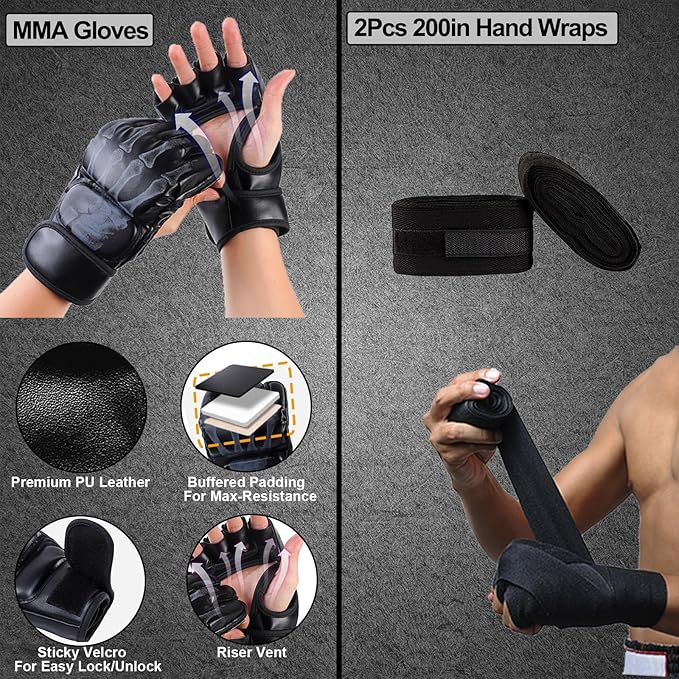- 【MMA Gloves & Hand Wraps】These gloves are crafted using premium PU leather, cushioned foam, and high-density PE, providing triple-layer protection for exceptional shock absorption. Palm perforation design for breathability and dryness. Secure a precise fit and extra wrist support with our included Hand Wraps, reducing the risk of wrist injuries.