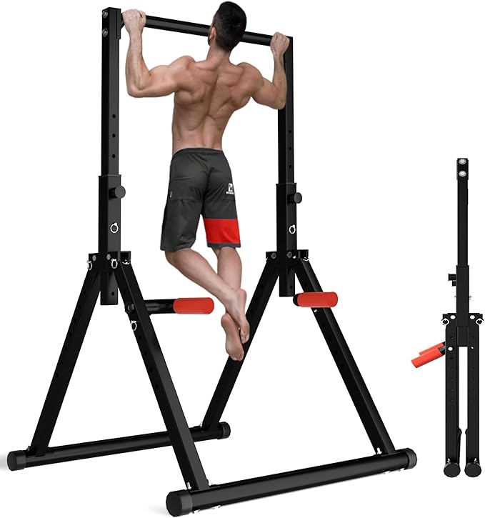 - 【Foldable Power Tower Dip Station】Dimensions: 45.7" x 49.2" x 67-90.6" Product weight: 43.2lbs You can easily fold up the pull up dip station when you are not using it. This space-saving design makes it perfect for small home gyms, workout areas or garages, as it won’t take up too much space.