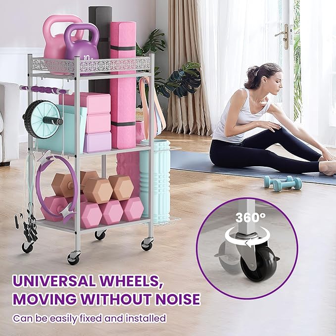 - 360° WHEELS and HOOKS: The home gym storage organizer has 4 universal wheels (2 of lockable), it is convenient for moving the foam roller cart and using sports equipment. There are removable hooks on the sides to hang towels, resistance bands, yoga wheels and more