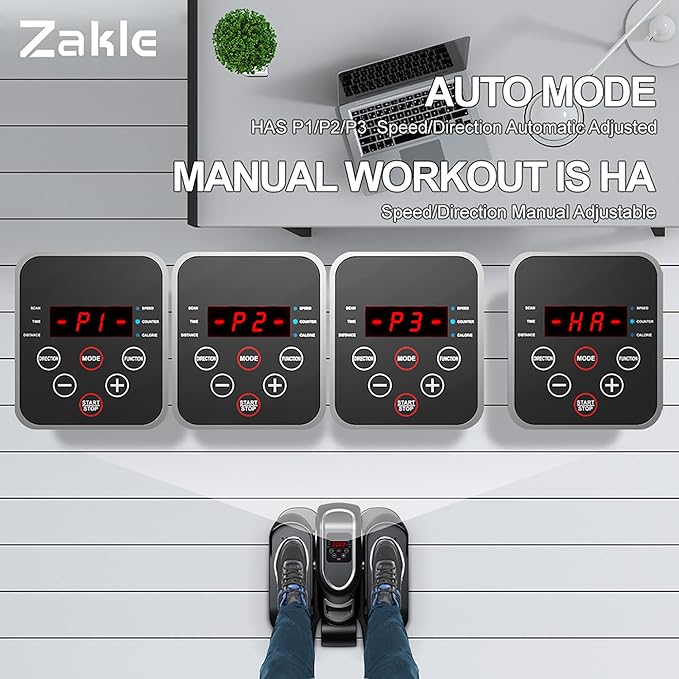 - 【Auto & Manual Mode】 The elliptical leg exerciser provides a dynamic workout experience in both automatic and manual modes. Seniors can choose from 1-4 low speed levels for leg exercise and relaxation. In manual mode, you can set up to 12 speeds and forward/backward directions using the remote control or the buttons. In Auto Mode, you can press the Mode button to adjust the P1-P12 pre programms, which automatically adjusts the speed and direction over a 30-minute period.