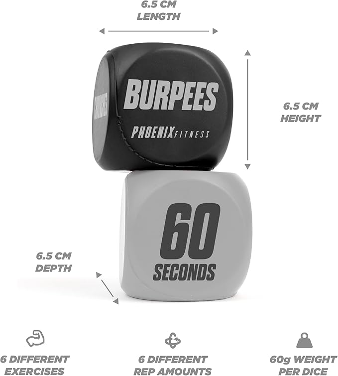 - PHOENIX FITNESS EXERCISE DICE: Our six-sided fitness dice is great for a full body workout, with a range of exercises to work your back, arms, legs and gets your heart pumping!