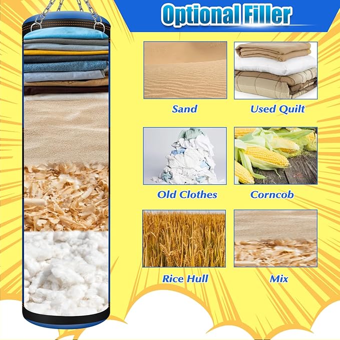 - Please Note: Punching bag for kids is unfilled, 2.7 ft tall and 10.2" wide, easy to carry and store. You can fill it with sand, old cloth, sawdust, shredded cotton fabric, soybean, corn, sponge and so on. But please don't just fill it with sand, the filler should preferably be no more than 44lbs