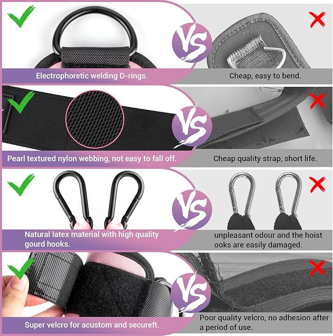 - [ANKLE RESISTANCE BANDS DESIGNED ONLY FOR WOMEN] Our ankle strap padding is made from a high quality neoprene material that wraps around your ankle in unparalleled softness and comfort. The matching three resistance bands are made of 100% pure natural latex, which is safer than regular synthetic latex. Best of all, the cool purple training poster we provide is easy to follow even for beginners!