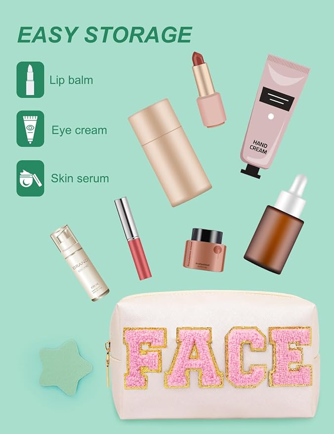 - ★GLITTER LETTER DESIGN - The patch makeup bag features vibrant "FACE" chenille letters with gold trim on one side, securely sewn onto the bag for long-lasting appeal