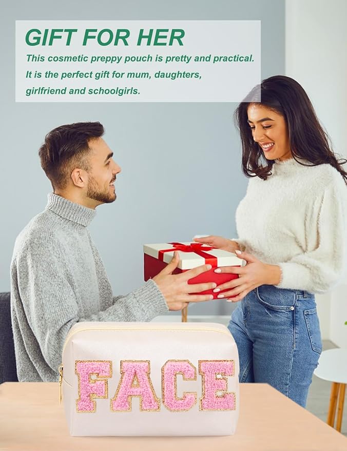 Preppy Makeup Bag, Synthetic Leather Patch Cosmetic Bag with FACE Chenille Letter for Skin Care, Gift for Girlfriend or Wife, Present for Girls, Daughter, Sister and Mother(Beige)