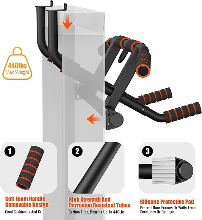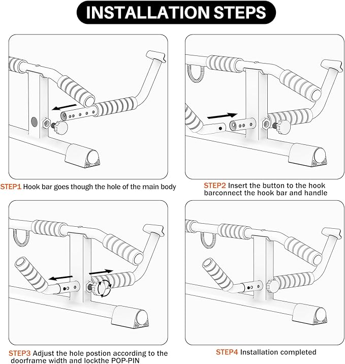 - 【DOORFRAME PROTECTION】 The 2 detachable buffer Premium silicone pads can prevent damage to your door frame.The bar leaves no mark on your frame.easy storage - Our pull up bar is a best time and space saver, and you can store it in few seconds after a convenient training.