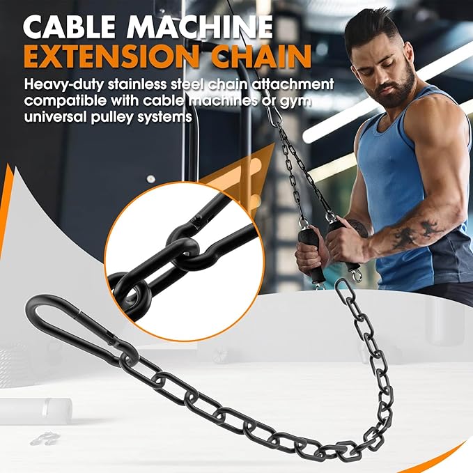 - Multi-Functionality:As a cable extension accessory for workout machine, the steel chain can be used for a variety of training programs, such as pull downs, curls, squats, hard pulls, bench presses, etc. It is suitable for use in strength racks, pulley systems, and weight lifting equipment, providing trainers with more diversified training choices. It can also be used for sandbags, locking gates or bicycles, fences and other