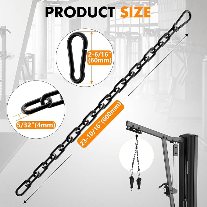 - Product Size: The weight lifting chain thickness is 0.16 inch(4 mm), length is 23-10/16"(600 mm), carabiner length is 2-6/16"(60 mm)