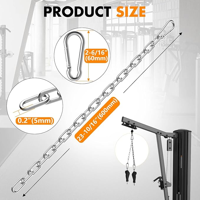 • Product Size: The workout chain thickness is 0.2 inch(5 mm), length is 23-10/16"(600 mm), carabiner length is 2-6/16"(60 mm)