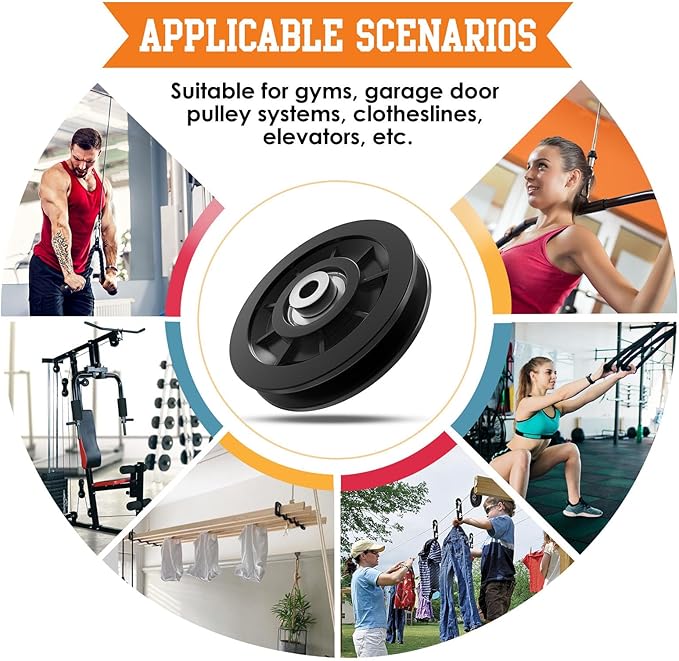 - Multiple Uses: The nylon gym pulley with bearing can be used as a replacement accessory for home gym equipment, gym tension ropes, DIY home projects, clotheslines, cable machines, garage door pulley lifting systems and more
