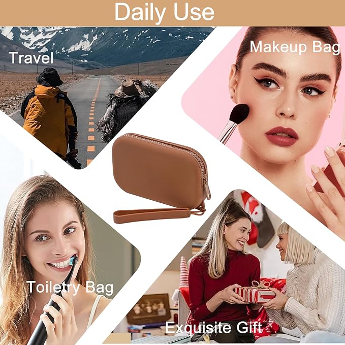 Portable Silicone Makeup Bag for Women, Small Travel Waterproof Toiletry Cosmetic Bag, Zipper Closure Organizer Makeup Case with Handle (Brown)