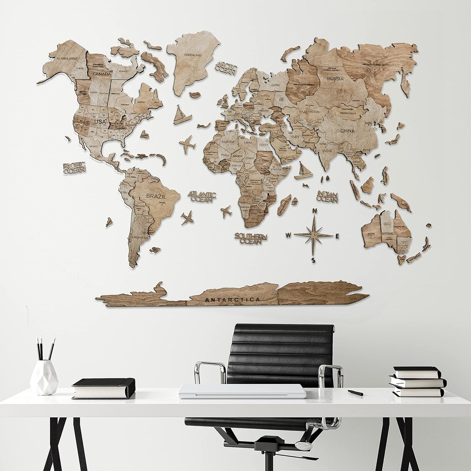 Handmade 3D Wood World Map Wall Art Large Wall Decor Track Your World Travels - Special For Home, Kitchen And Office (Large, Terra)