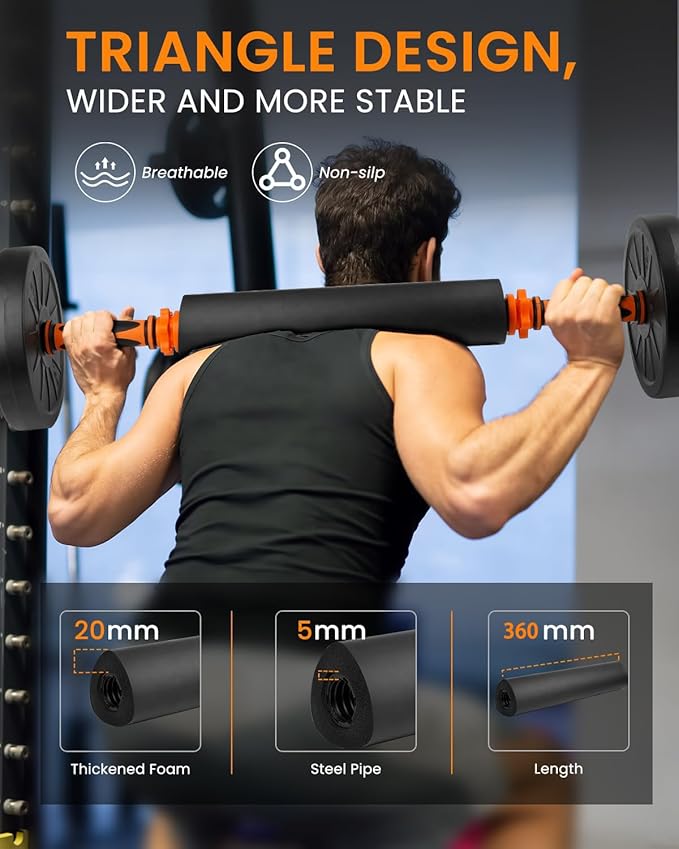 - 【TRIANGLE DESIGN SHOULDER FIT】The barbell connecting rod is made of a 5mm thick steel tube + 20mm thick high-quality foam.The triangular surface structure provides a stable and balanced structure. Perfectly contoured to your shoulders, it relieves neck strain, ensuring optimal comfort during workouts
