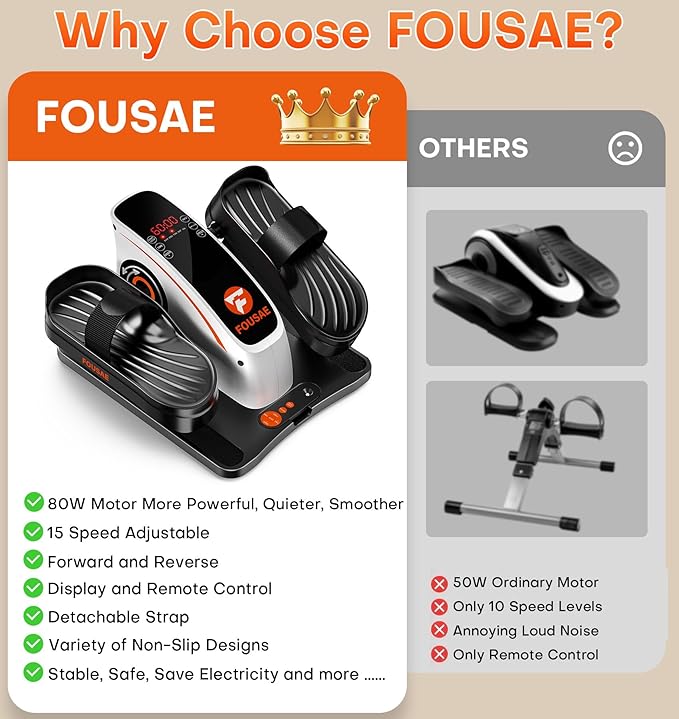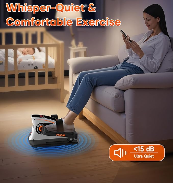 - 2025 Upgraded Under Deak Elliptical: The FOUSAE under desk elliptical features 15 adjustable speed levels and 2 workout modes—Forward & Reverse motion. Equipped with an ultra-smooth, whisper-quiet 80W motor and dual control options (remote & touch screen). Designed with detachable pedal straps and a portable handle for easy mobility and storage. 100% pre-assembled and ready to use, FOUSAE delivers a stronger, smoother, longer-lasting, and more comfortable workout experience