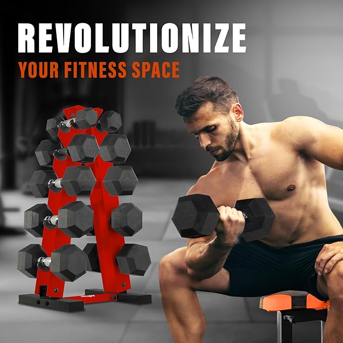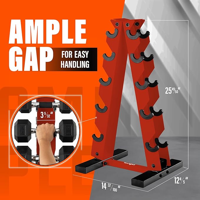 • DURABLE RUBBER PAD: Built with high-quality rubber pad, A frame dumbbell rack emits a pleasant smell during workouts; The rubberized pads prevent dumbbell handles from touching the steel frame, protecting the plating and making it easier to place dumbbells on the rack