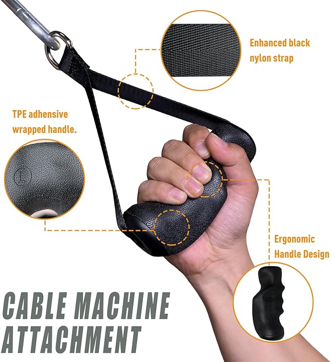 - Ergonomic Handle Design: The handle of the cable machine attachment is specially designed in the hand grip shape which provides a firm and comfortable natural grip to alleviate hand pressure while doing workouts.Plus, the slip-proof particle texture on the surface of the handles will make your exercises more safe