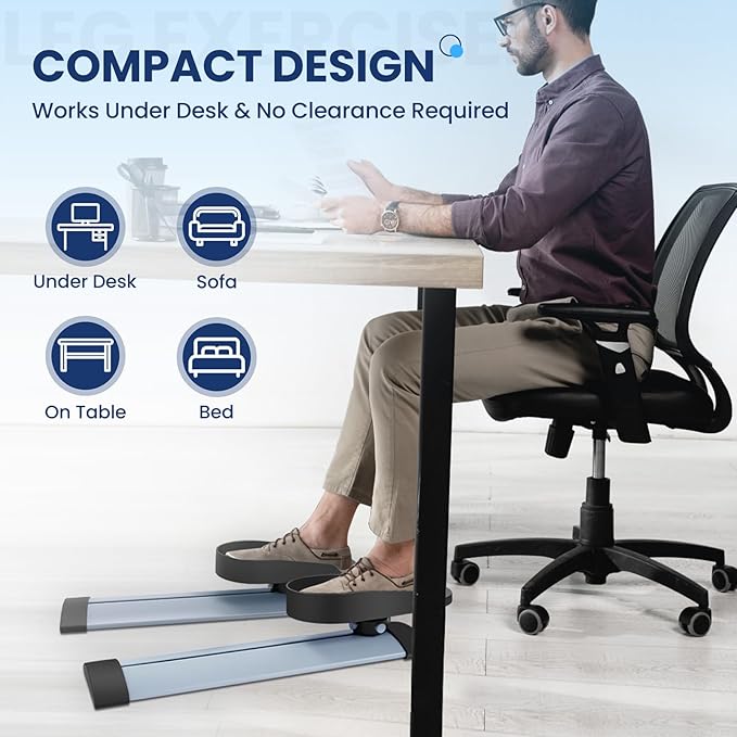 - DISCREET UNDER-DESK ELLIPTICAL: This low-profile(requires no clearance) elliptical trainer allows for low impact, seated exercises that enhance range of motion in knees and hips. The under desk leg exerciser strengthens muscles and joints while promoting overall cardiovascular health. Perfect for those who sit for long periods, it improves leg circulation to help prevent leg and shoulder numbness or tingling. (NOT FOR CARDIO EXERCISES)