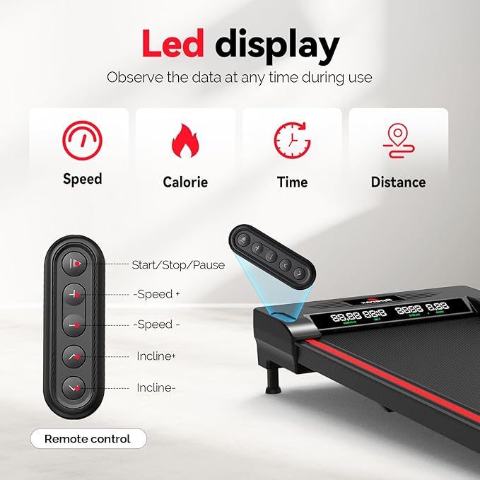 - 【Remote Control &led display】 Treadmill display allows you to track speed, time, distance and calorie movements at any time. Remote control at any time You can use the remote control to control the speed, elevation and gradient, and switch the switch of the walking pad