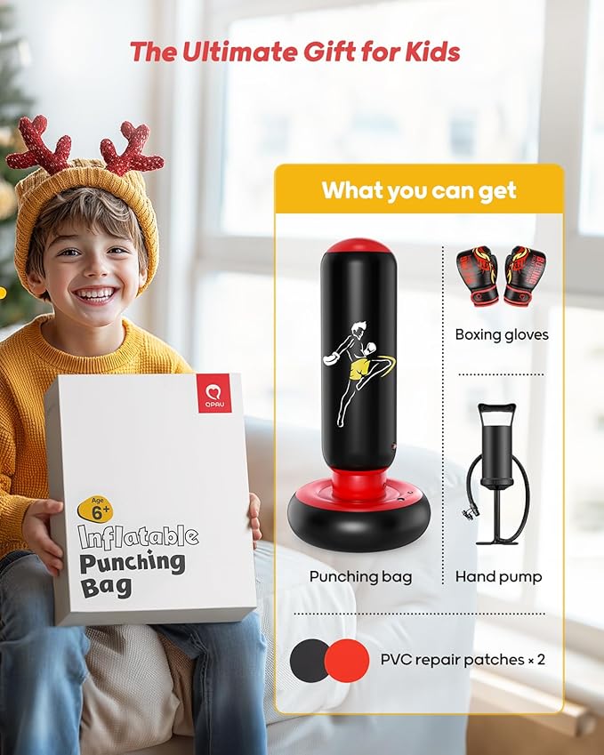 - IDEAL SIZE: The kids punching bag is 66 inches tall after fully inflated. It’s designed for kids 6+ years old and encourages more enjoyable family time. Its bottom base is 31 inches long in diameter, wider than most punching bags on the market, and that provides more stability with weight. The inflatable punching bag helps children strengthen physical fitness and relieve energy while they are at home.