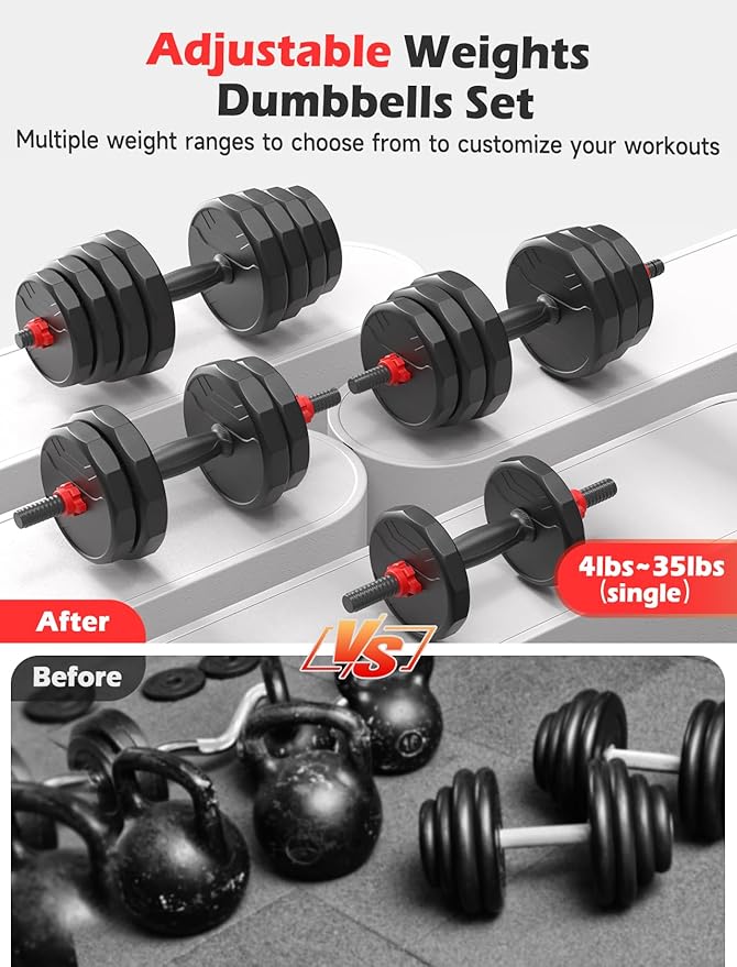 - Quick and Easy Adjustments: This adjustable dumbbell set allows for quick and easy weight changes, with a single dumbbell's adjustable weight range from 4lbs to 35lbs. The detachable design makes weight adjustments simple, ensuring you can switch between different exercises seamlessly, from light workouts to intense training sessions.