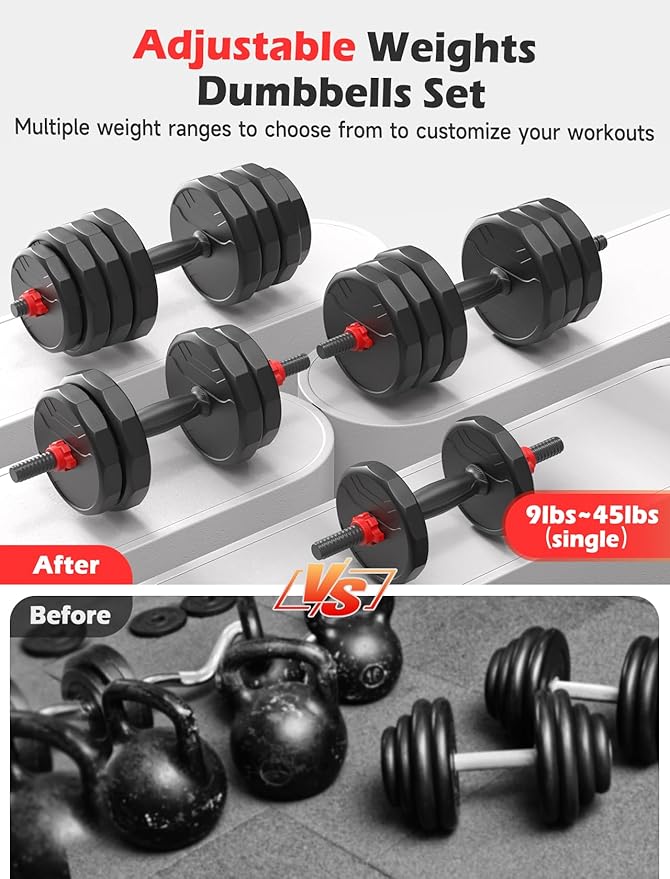 • Quick and Easy Adjustments: This adjustable dumbbell set allows for quick and easy weight changes, with a single dumbbell's adjustable weight range from 9lbs to 45lbs. The detachable design makes weight adjustments simple, ensuring you can switch between different exercises seamlessly, from light workouts to intense training sessions.