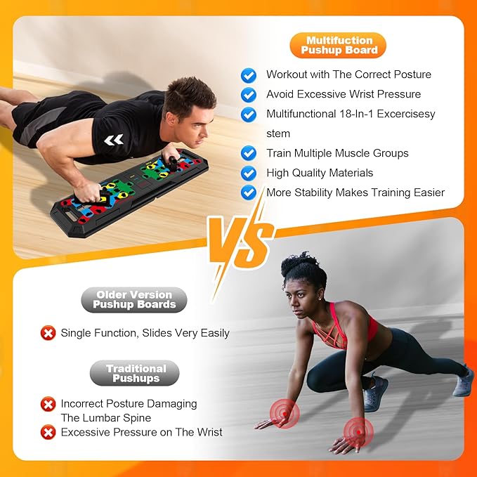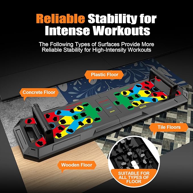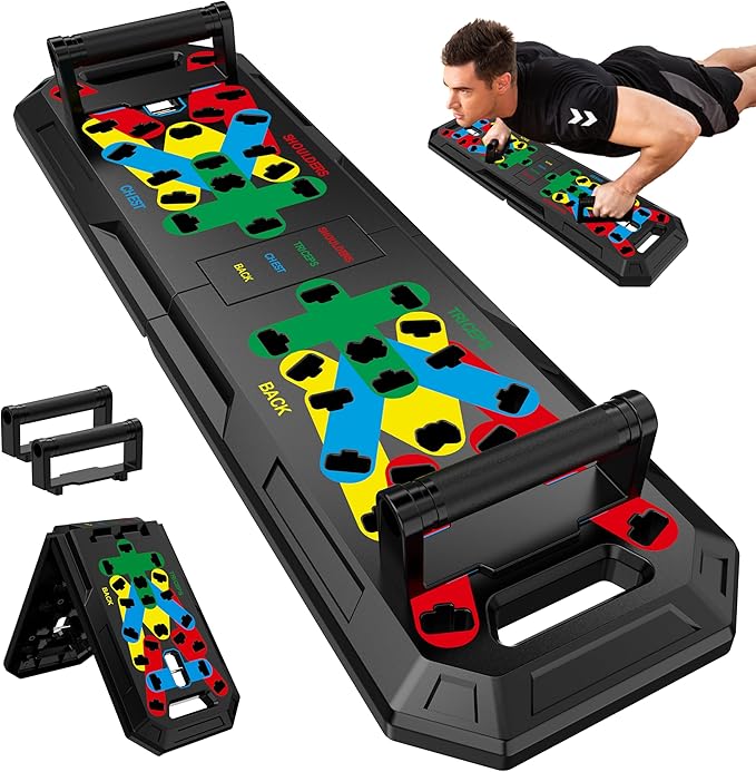 - Multi-functional: The multi-functional training board comes with an upgraded design and a color-coded guide. It targets different muscle groups (chest, shoulders, abs, biceps, back), allowing various combinations of positions to achieve more push-up angles.